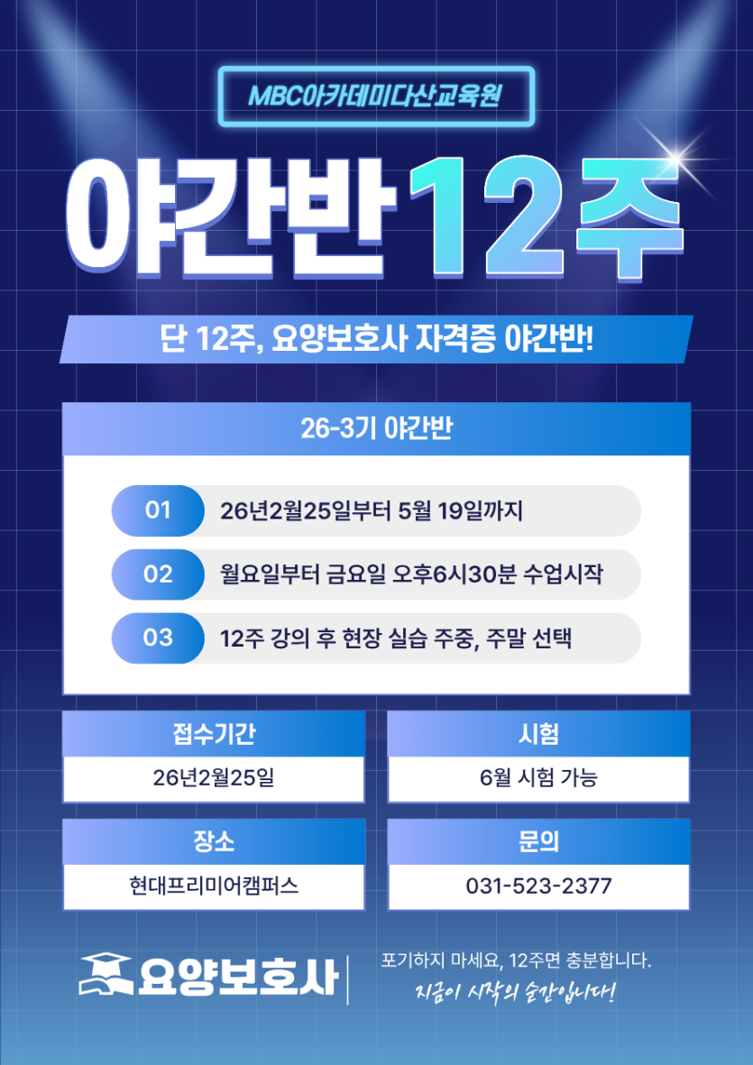 26년 첫 야간반 개강합니다 미리미리 접수 하셔서 이번 기회에 요양보호사 자격증을 취득하실길 바랍니다