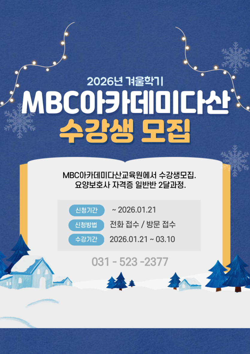 MBC아카데미다산요양보호사교육원에서 26년 첫 주간반 수강하세요