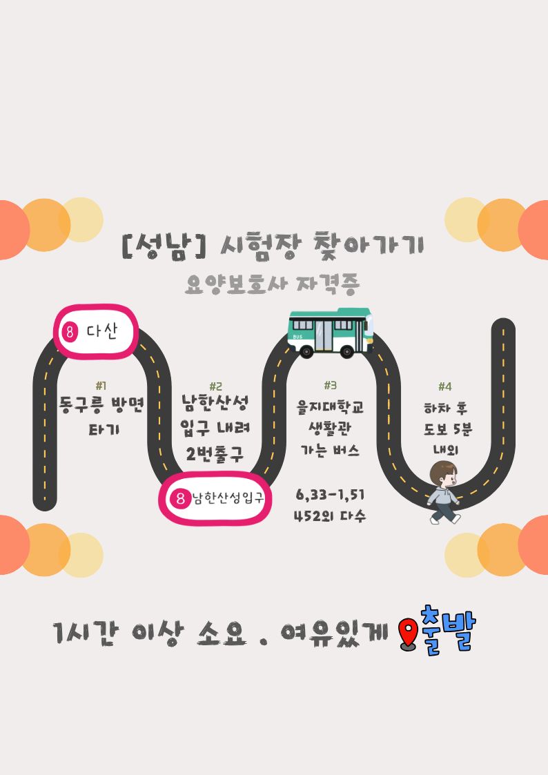 8호선 다산역이 개통함에 따라 대중교통으로 1시간 소요 성남 시험장에 도착할수 있게 되었습니다.